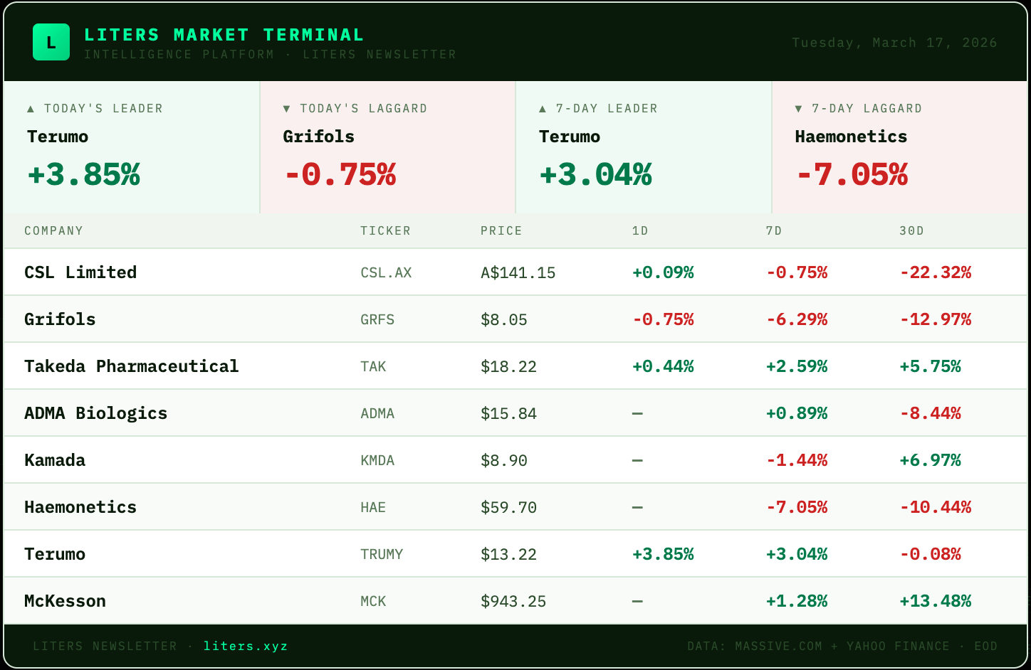 CSL's 81% profit drop and 4% revenue decline in H1 2026 reported in February continues to weigh on the plasma manufacturing leader, which fell another 0.75% this week. The performance divergence between equipment providers and plasma manufacturers is stark: Terumo rose 3.04% while the pure-play manufacturers struggled. This suggests investors are differentiating between companies dependent on plasma collection volumes versus those selling equipment into a recovering procedure environment.